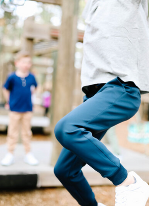 Boys love how our buttery, soft, performance fabric is flexible enough to run, jump, squat, and play all day without any restriction. There are no itchy tags, no annoying buttons or zippers, and no bulky internal adjustable buttons. Our pants pull on and feel like stretchy sweatpants, but look like dress pants. They are the only pants your boys will ever want to wear!