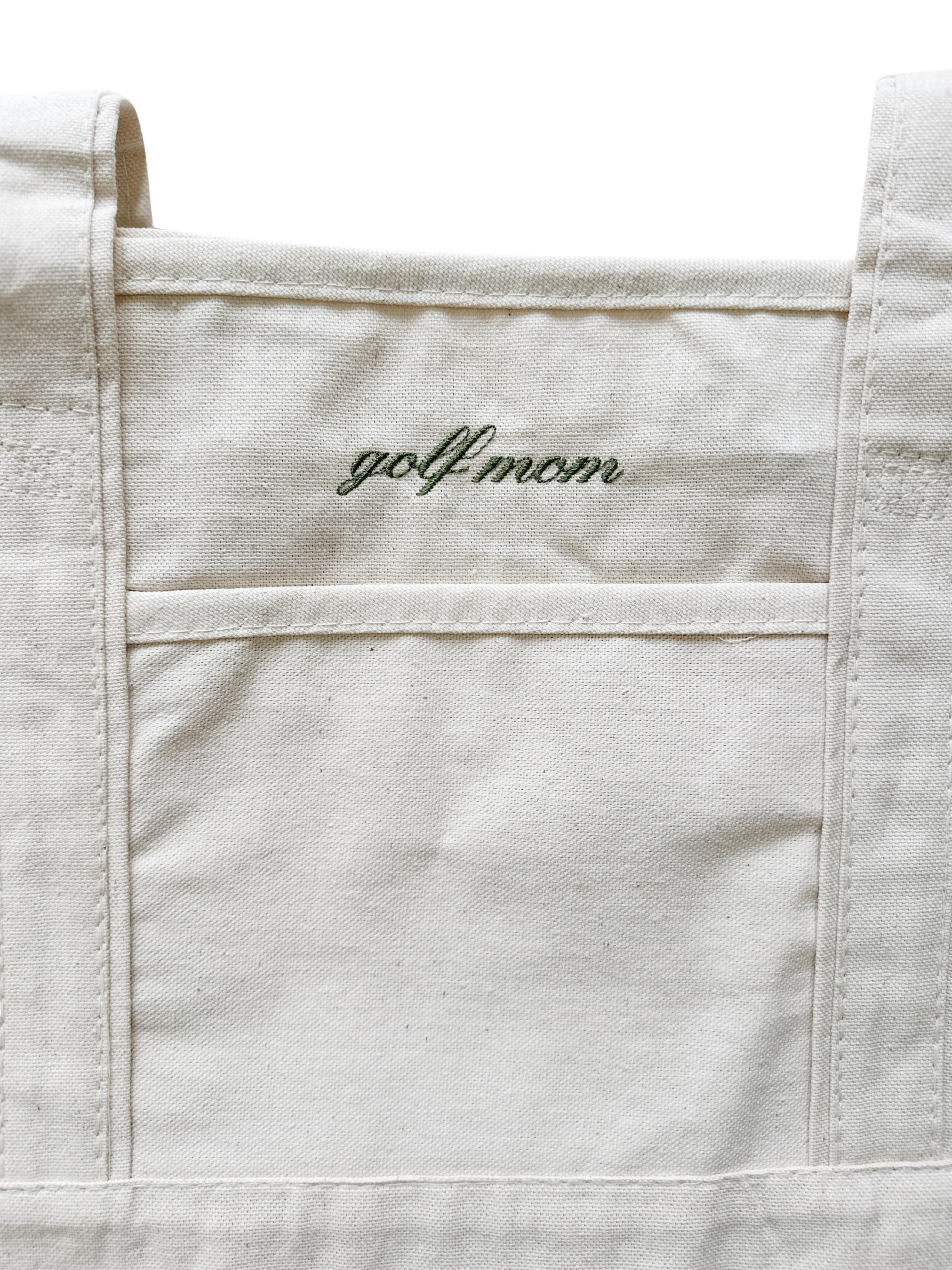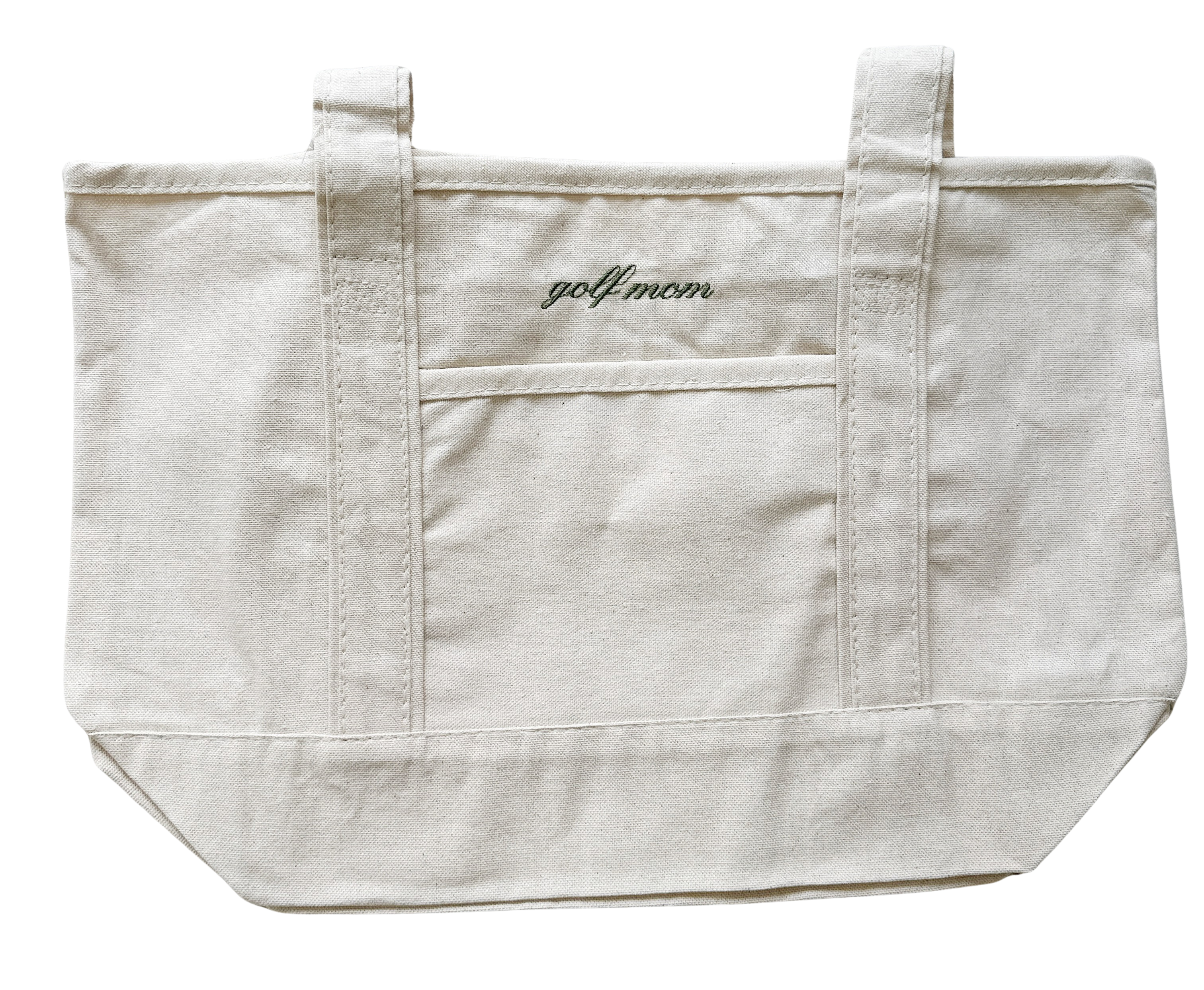 For early tee times, tournament weekends, and life lived between the range and the clubhouse. This everyday canvas tote features “golf mom” embroidered in classic green, celebrating the moms who carry it all — snacks, sunscreen, extra gloves, and endless encouragement.